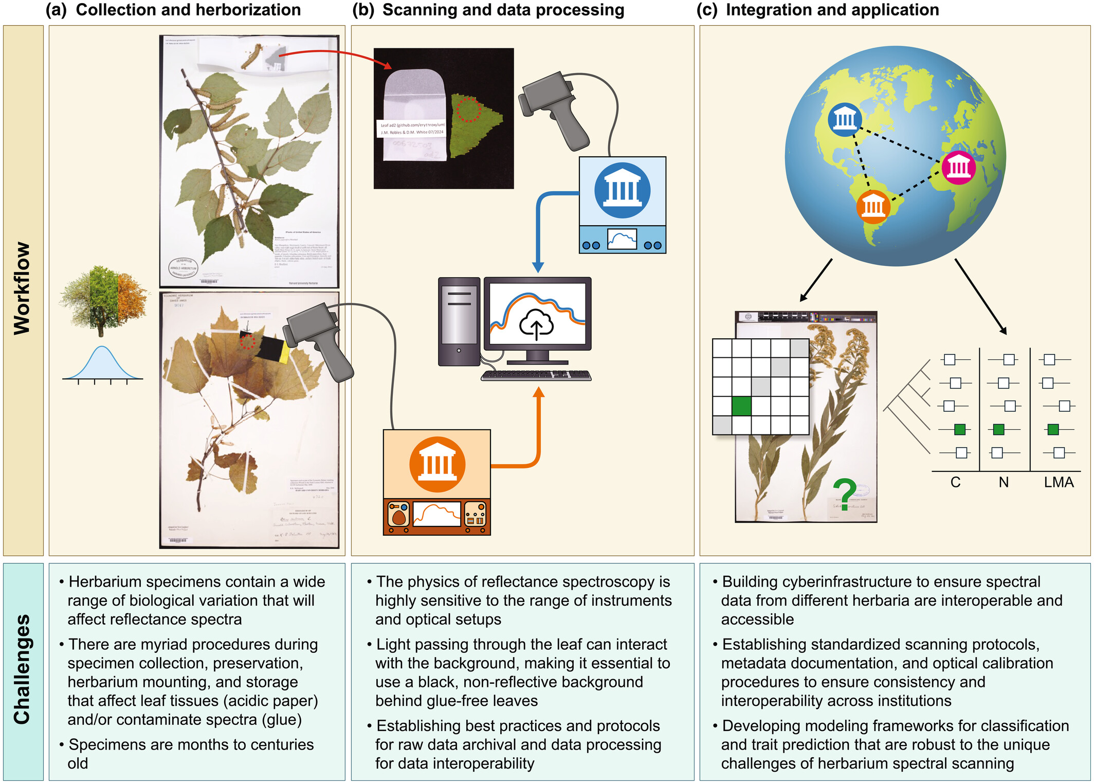Fluxo de trabalho de digitalização espectral de herbários, desde a coleta de espécimes até a integração global, e desafios. © New Phytologist.